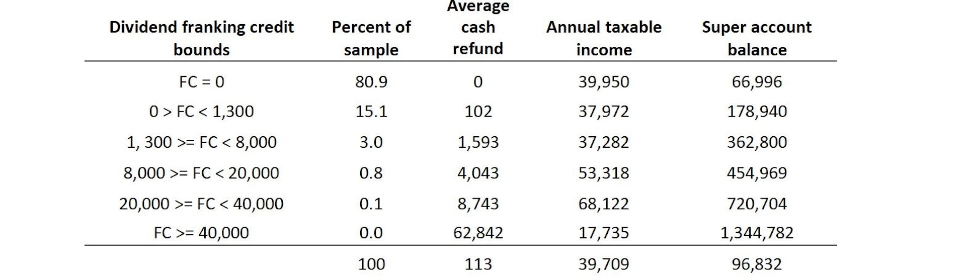 Of the 3% of individuals with credits between A$1,300 and A$8,000, the average cash refund is A$1,593. The average taxable income for the group is just over A$37,000 and the average superannuation balance is about A$363,000.